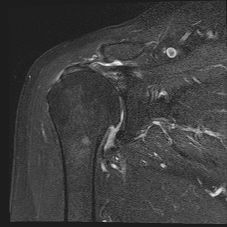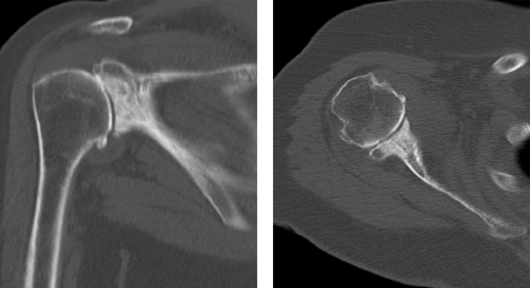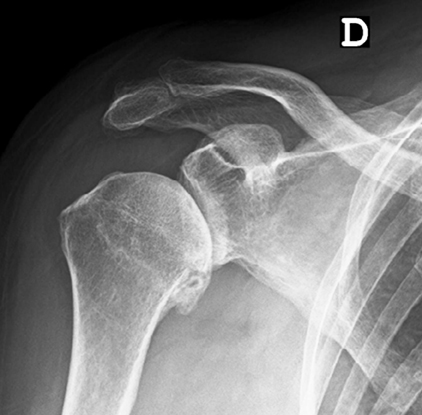 Normalmente o diagnóstico é feito através da radiografia (fig. 6) e tomografia computadorizada (para melhor determinar a versão da glenoide ou seu stock ósseo) (fig. 7) ou ressonância magnética (melhor avaliar integridade da coifa dos rotadores e infiltração gorda).