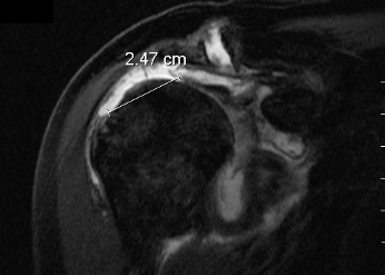 A Ressonância Magnética mostra a localização da rotura, a dimensão, a qualidade do tendão rompido, sendo por isso o exame mais importante numa suspeita de rotura da coifa dos rotadores. (Fig. 4)
